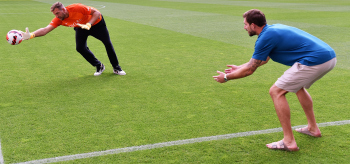17.08.2022 Frankfurt am Main, Deutsche Bank Park Benefizspiel Champions for Charity PK Rollentausch gibt den Torwart Dirk Nowitzki mit Torwart Kevin Trapp ( 1, Eintracht Frankfurt) emspor, ********* Foto: Peter Hartenfelser