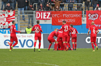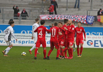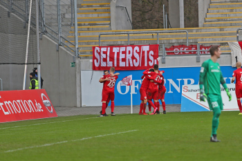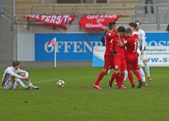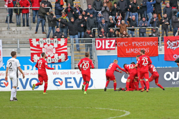 11.02.2018, xxx, Fussball Regionalliga, Kickers Offenbach - SV 07 Elversberg, emspor, v.l. Ko Sawada (Kickers Offenbach), Tor zum 3:0 89. Minute, Torjubel Dren Hodja (Kickers Offenbach), Serkan Firat (Kickers Offenbach), Semih Sentuerk (Kickers Offenbach),