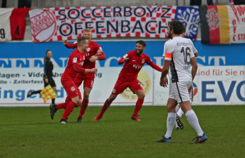 11.02.2018, xxx, Fussball Regionalliga, Kickers Offenbach - SV 07 Elversberg, emspor, v.l. Ko Sawada (Kickers Offenbach), Tor zum 3:0 89. Minute, Torjubel Dren Hodja (Kickers Offenbach), Steffen Bohl (SV 07 Elversberg),