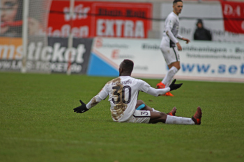 11.02.2018, xxx, Fussball Regionalliga, Kickers Offenbach - SV 07 Elversberg, emspor, v.l. J. Koffi (SV 07 Elversberg), am Boden
