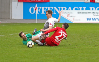 11.02.2018, xxx, Fussball Regionalliga, Kickers Offenbach - SV 07 Elversberg, emspor, v.l. Frank Lehmann Torwart (SV 07 Elversberg), Steffen Bohl (SV 07 Elversberg), Ihab Darwiche (Kickers Offenbach),