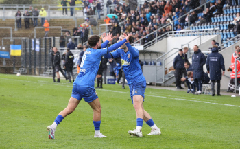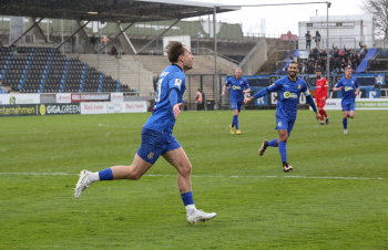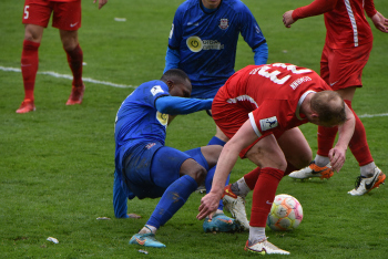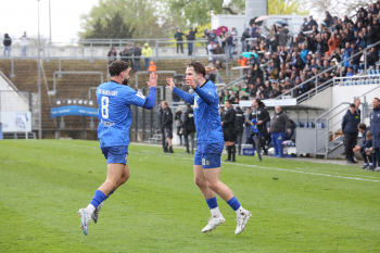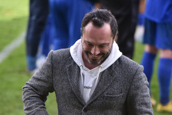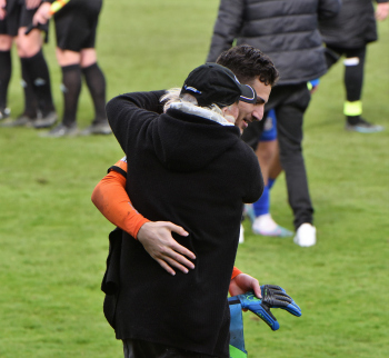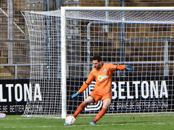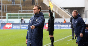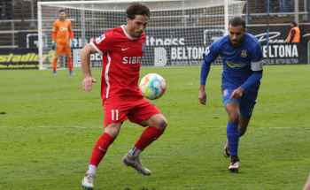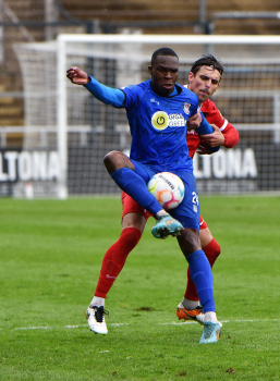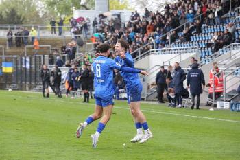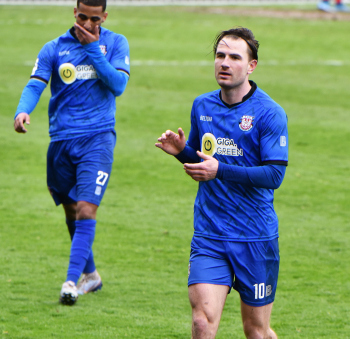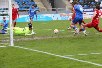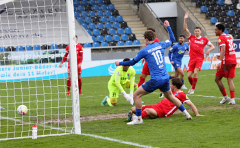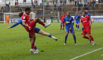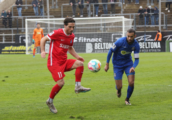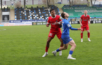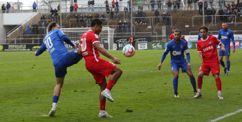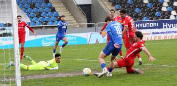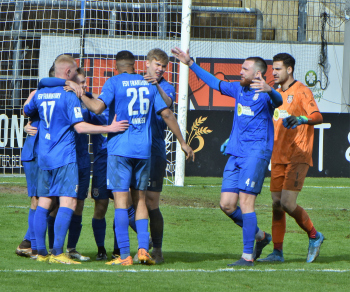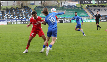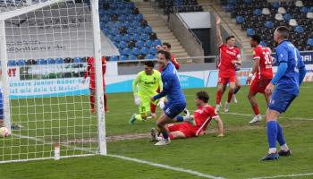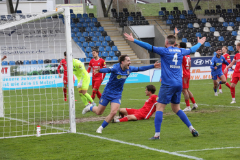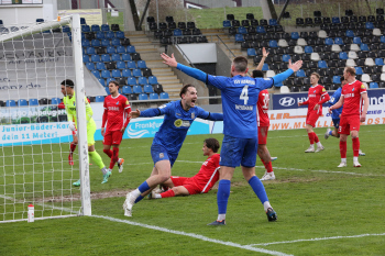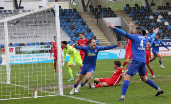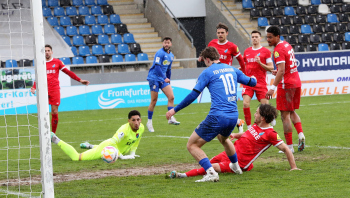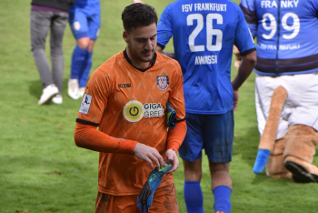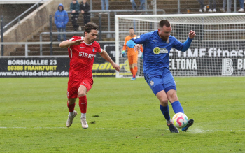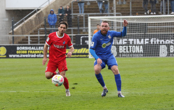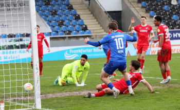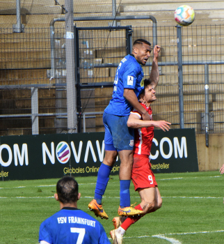 1:0 für den FSV Frankfurt durch ein Eigentor von Serkan Firat (11, Steinbach) nach Zweikampf mit CAS PETERS (10, FSV Frankfurt), CAS PETERS (10, FSV Frankfurt) jubelt mit Tim Weissmann (4, FSV Frankfurt)