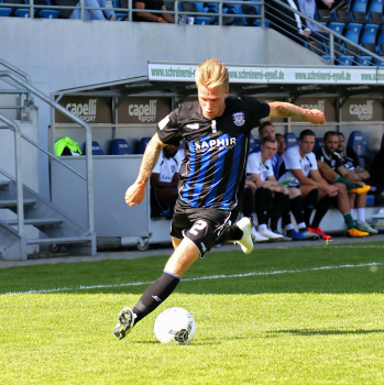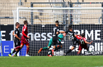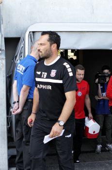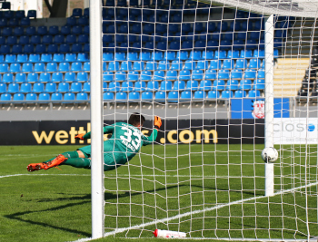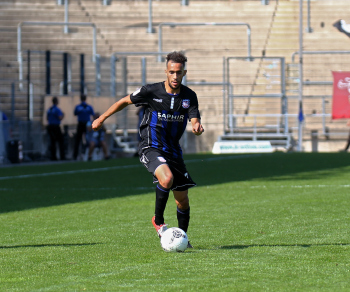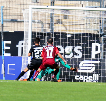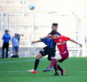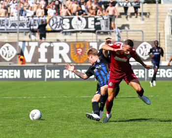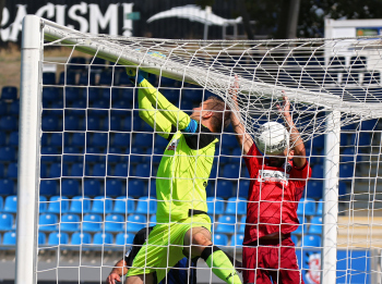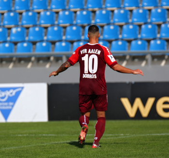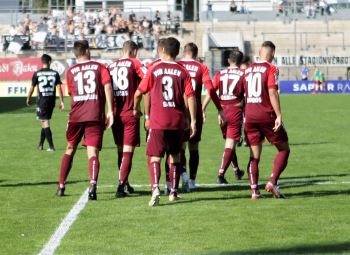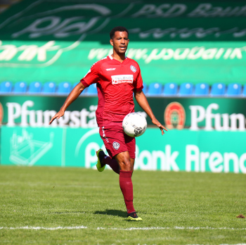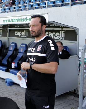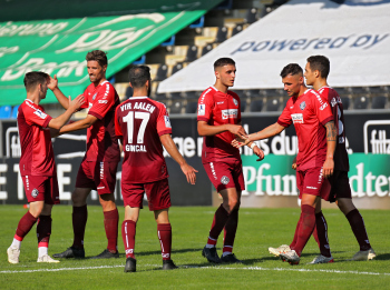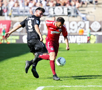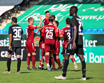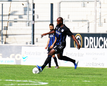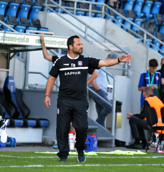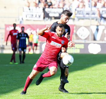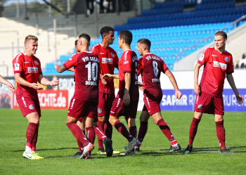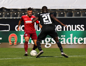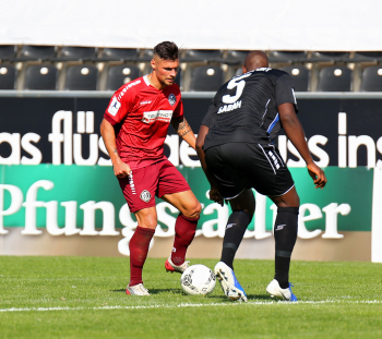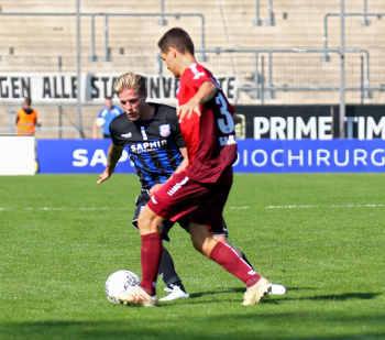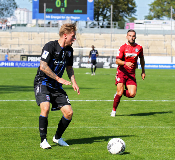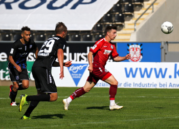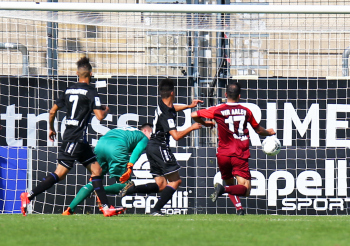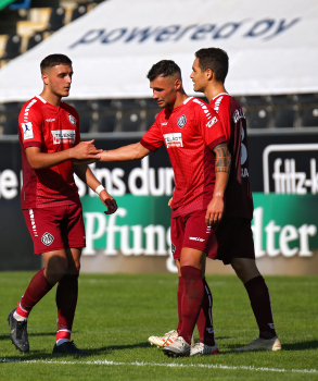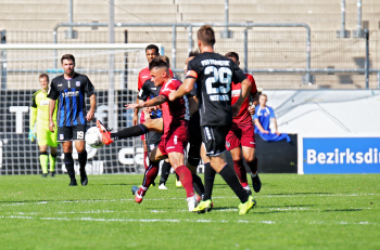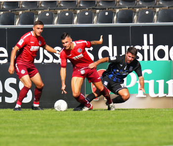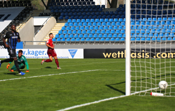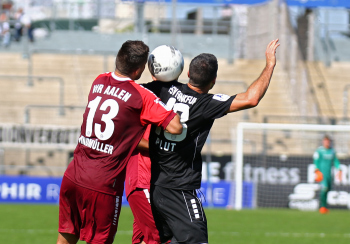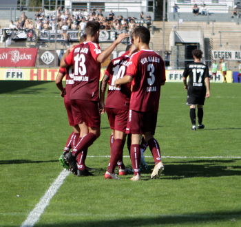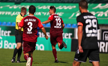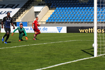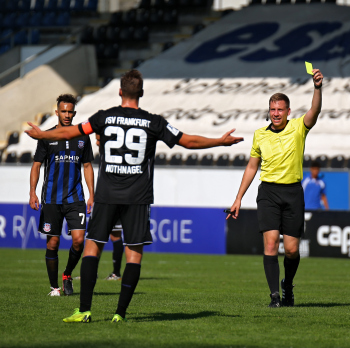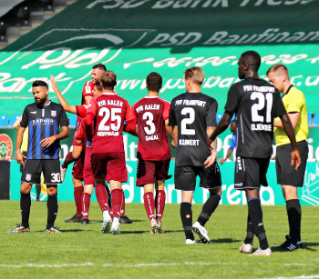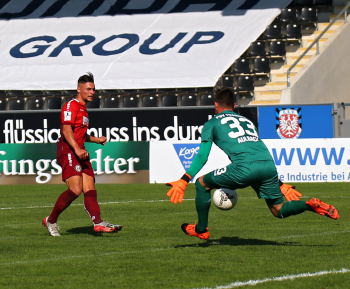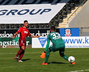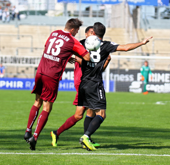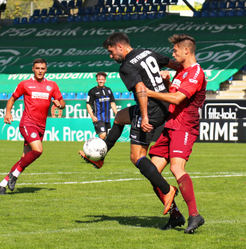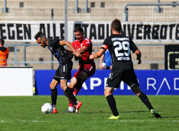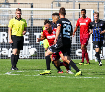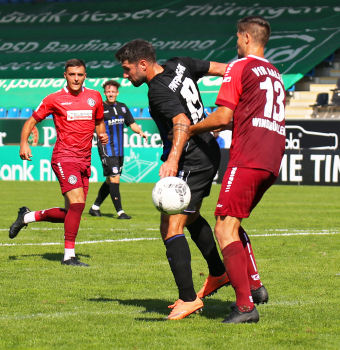 14.09.2019, xxx, Frankfurt, PSD Arena, Fussball, Regionalliga Suedwest, Saison 2019-2020, FSV Frankfurt gegen VfR Aalen; Chance VfR Aalen Robin Williams (FSV Frankfurt), Ahmed Azaouagh (FSV Frankfurt), und Marco Aulbach Torwart (FSV Frankfurt), retten