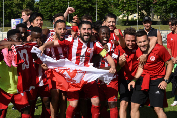 Jubel bei SG Rot-Weiss Frankfurt II u.a. Kapit?n Patrick G?rser ?ber den Aufstieg in die Verbandsliga S?d