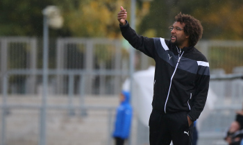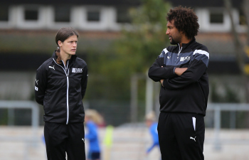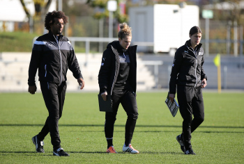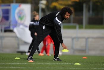 der neue Cheftrainer beim FFC Frankfurt Philippe Kabo mit seinen Co-Trainerinnen Kim Kulig und Kerstin Garefrekes