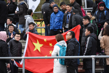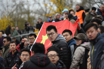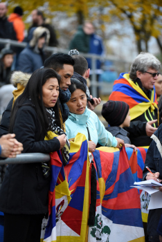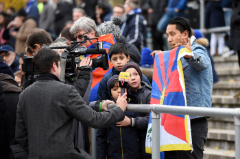 Spielunterbrechung aufgrund Tibet Fahnen Demonstranten der Tibet-Initiative zeigen die Flagge von Tibet und die Chinesische Mannschaft fühlt sich provoziert, die Aufmerksam der Medien ist aber der kleinen Gruppe sicher