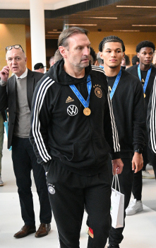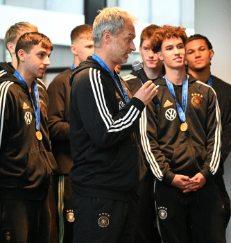 04.12.2023 Frankfurtam Main, DFB-Campus Empfang der U17-Weltmeister_Nationalmanschaft Der DFB ist stolz auf seine U17-Weltmeister Bild zeigt: U17-Weltmeister-Trainer Christian Wück daneben Noah Darvich (Deutschland) ********* Foto: Peter Hartenfelser