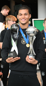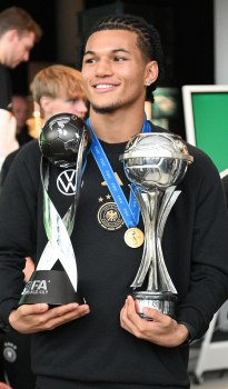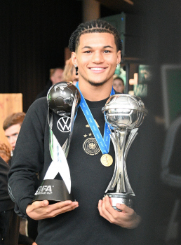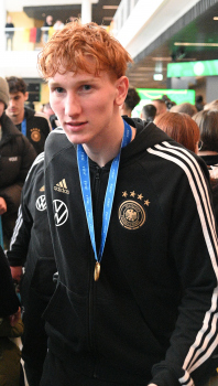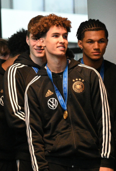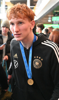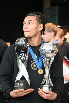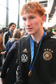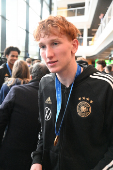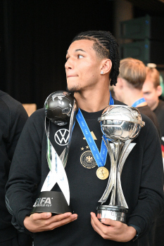 04.12.2023 Frankfurt am Main, DFB-Campus Empfang der U17-Weltmeister_Nationalmanschaft U17-Weltmeister Paris Brunner (GER) ********* Foto: Peter Hartenfelser