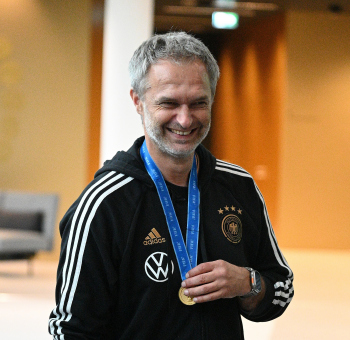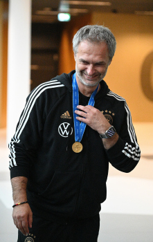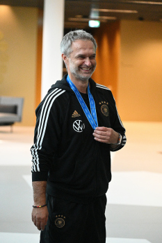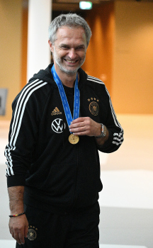 04.12.2023 Frankfurtam Main, DFB-Campus Empfang der U17-Weltmeister_Nationalmanschaft Der DFB ist stolz auf seine U17-Weltmeister Bild zeigt: U17-Weltmeister-Trainer Christian Wück ist stolz auf seine Jung und seine Medaille ********* Foto: Peter Hartenfelser