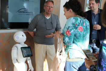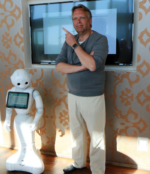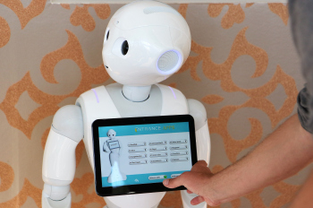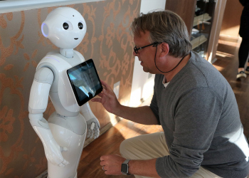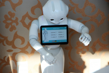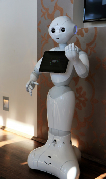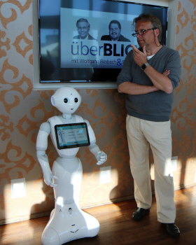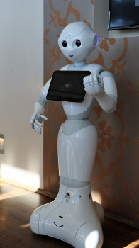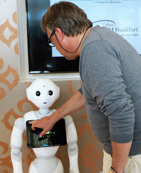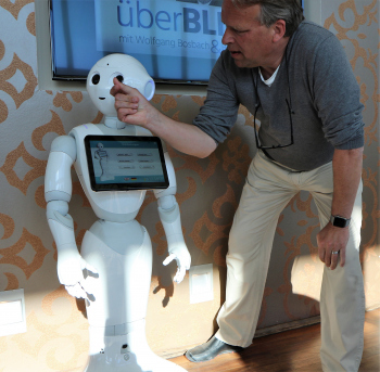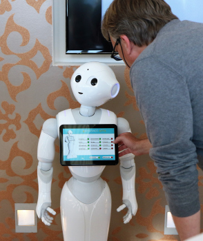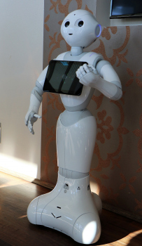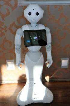 Pepper ist ein humanoider Roboter, der darauf programmiert ist, Menschen und deren Mimik und Gestik zu analysieren und auf diese Emotionszustände entsprechend zu reagieren