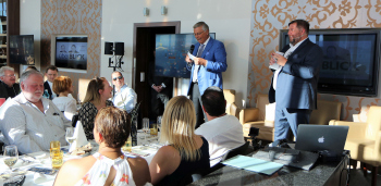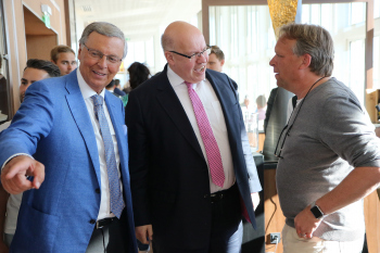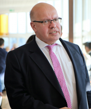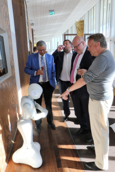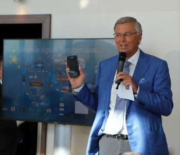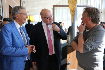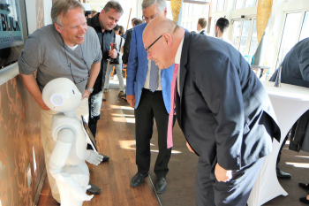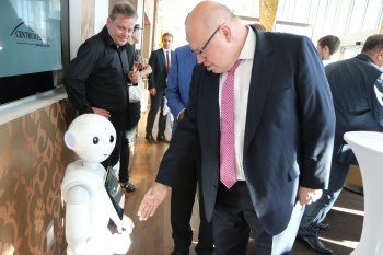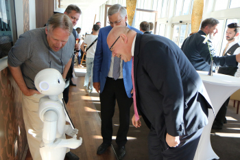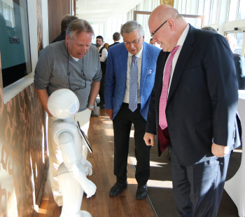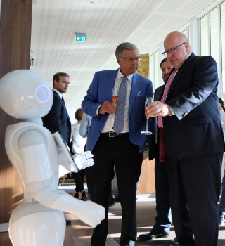 Bild zeigt: ZukunftsMacher Jörg Heynkes (Aktivist, Innovator, Unternehmer, Speaker), Wolfgang Bosbach, Bundeswirtschaftsminister Peter Altmaier und Roboter Pepper