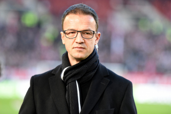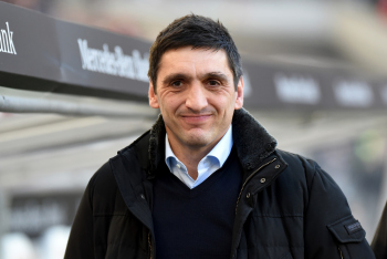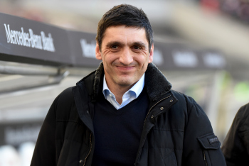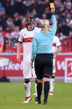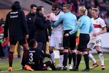 Simon Falette (Eintracht Frankfurt) am Boden, Vierter Offizieller Alexander Sather, Trainer Niko Kovac (Eintracht Frankfurt), Christian Gentner (VfB Stuttgart), Schiedsrichter-Assistent Thomas Stein, Schiedsrichterin Bibiana Steinhaus, Andreas Beck (VfB Stuttgart).