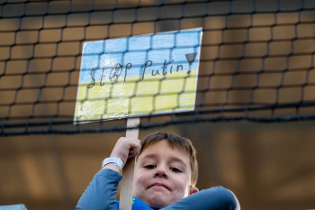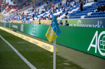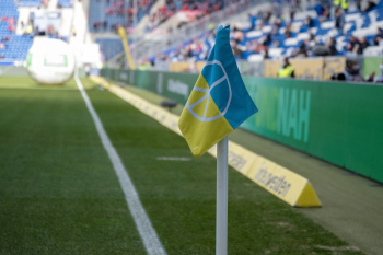 Feature, Symbolbild, die Eckfahne in den ukrainischen Farben mit dem Peace Zeichen.