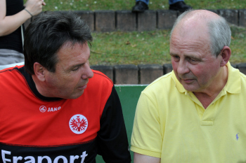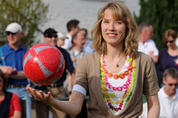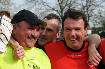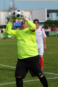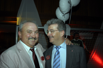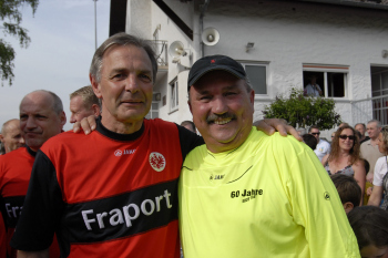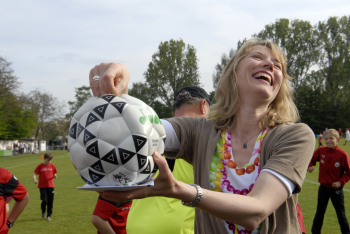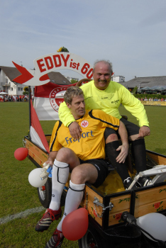 19.04..2010, Der Frankfurter Kultwirt Eddy Hausmann feierte seinen 60. Geburtstag, Eintracht Maskottchen Attila ist der ARD-Lottofee Franziska Reichenbacher nicht geheuer