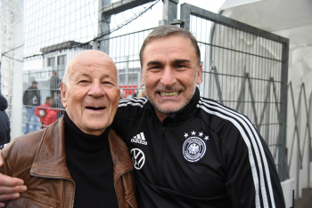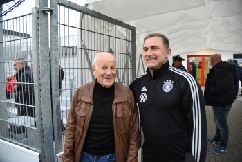 07.10.2019 Dreieich Qualifikation für die U 21-Europameisterschaft 2021 DFB deutsche U 21-Nationalmannschaft Training Trainer Stefan Kuntz hier mit Frankfurter Sportreporter-Legende Hartmut Scherzer ********* Foto: Peter Hartenfelser