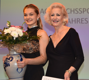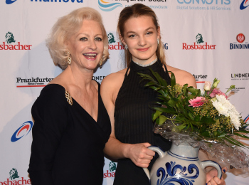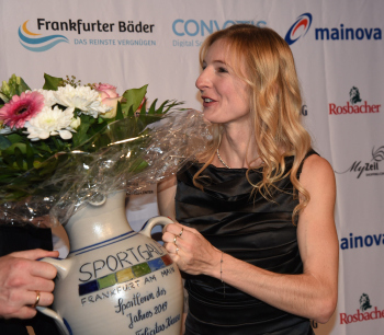 Bild zeigt Moderatorin Sonya Kraus und Leon Bunn mit Marathonläuferin Katharina Steinruck, die den Preis Sportlerin des Jahres für Leichtathletin Gesa Felicitas Krause entgegennahm