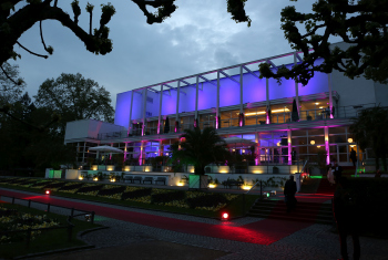 das Gesellschaftshaus Palmengarten von aussen, beleuchtet, Daemmerung, roter Teppich, Symbolbild