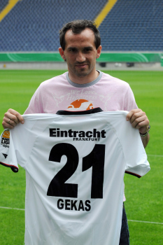 26.05.2010, 1. Bundesliga, Eintracht Frankfurt PK zu Vorstellung des Neuzugangs von Theofanis "Fanis" Gekas, Theofanis "Fanis" Gekasmit dem Trikot Nummer 21 - sein Wunsch ist die Nummer 22