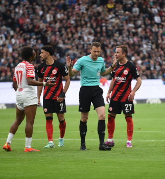 Schiedsrichter FElix Zwayer -Lois Openda (RB Leipzig),Omar Marmoush (7, Eintracht Frankfurt), Mario Götze (27, Eintracht Frankfurt)
