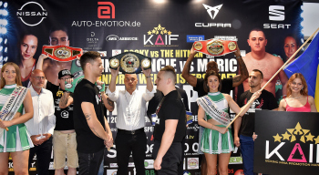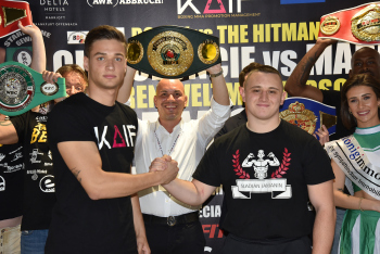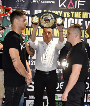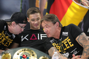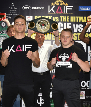 18.05.2022 Offenbach am Main, Heimspiel - Luca ROCKY Cinqueoncie: Junioren Boxweltmeisterschaft WBC/IBF/IBO Pressekonferenz Bild zeigt: Junioren Boxweltmeister Luca ROCKY Cinqueoncie mit seinem Genenr HITMAN Leon Maric mit Rockys Manager Rainer Gottwald ********* Foto: Peter Hartenfelser