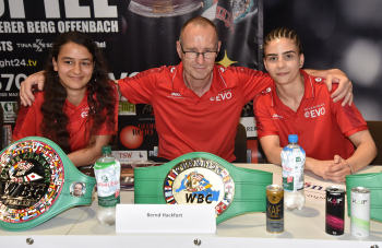 18.05.2022 Offenbach am Main, Heimspiel - Luca ROCKY Cinqueoncie: Junioren Boxweltmeisterschaft WBC/IBF/IBO Pressekonferenz Boxclub-Nordend Offenbach Chef Bernd Hackfort mit seinen Boxerinnen und Maria-Elena Avram und Georgiana-Diana Podaru ********* Foto: Peter Hartenfelser
