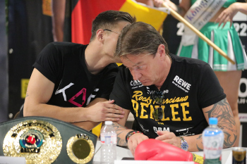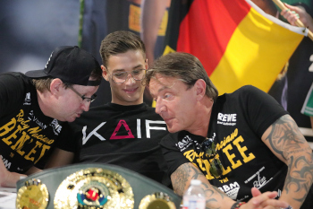 18.05.2022 Offenbach am Main, Heimspiel - Luca ROCKY Cinqueoncie: Junioren Boxweltmeisterschaft WBC/IBF/IBO Pressekonferenz Auch bei der Pressekonferenz FC Ingolstadt Torwart-Trainer Robert Wulnikowski mit seinem Sohn Dario ********* Foto: Peter Hartenfelser