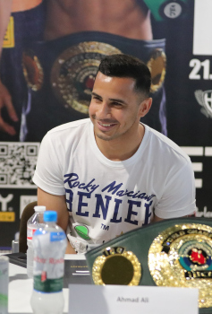 18.05.2022 Offenbach am Main, Heimspiel - Luca ROCKY Cinqueoncie: Junioren Boxweltmeisterschaft WBC/IBF/IBO Pressekonferenz Boxer "Action" Ahmad Ali freut sich auf den Kampf am Samstag ********* Foto: Peter Hartenfelser