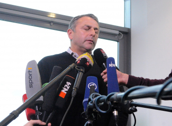 WOLFSBURG, DEUTSCHLAND. 11.01.2015, FUSSBALL - VfL Wolfsburg, Pressekonferenz zum Tod von VfL Wolfsburg Spieler Junior Malanda, 1. Bundesliga, Saison 2014-2015, Volkswagen Arena. Bild zeigt: Manager Klaus Allofs (VfL Wolfsburg) beantwortet Fragen von Journalisten.