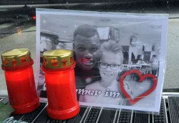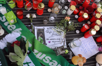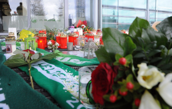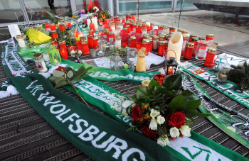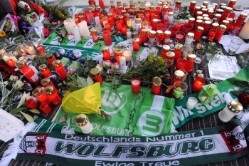 WOLFSBURG, DEUTSCHLAND. 11.01.2015, FUSSBALL - VfL Wolfsburg, Pressekonferenz zum Tod von VfL Wolfsburg Spieler Junior Malanda, 1. Bundesliga, Saison 2014-2015, Volkswagen Arena. Bild zeigt: Blumen, Kerzen, Schals und Briefe liegen vor der Wolfsburger Arena.