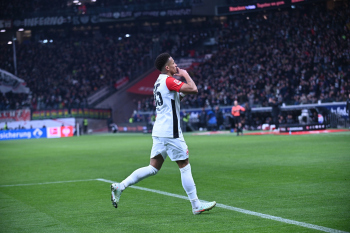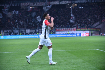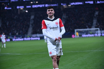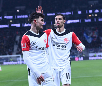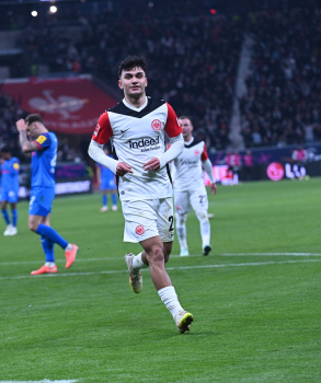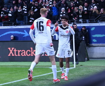 Torjubel nach dem Tor zum 1:0 durch Hugo Larsson (16, Eintracht Frankfurt) hier mit Arthur Theate (3, Eintracht Frankfurt)