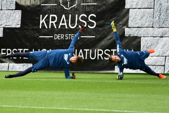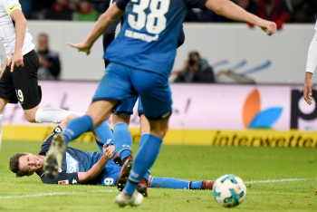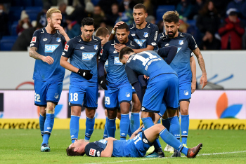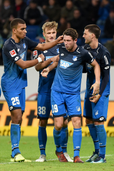 Schmerzhafter Torjubel des Torschuetzen Mark Uth (TSG 1899 Hoffenheim), Jubel und Freude bei Kevin Vogt (TSG 1899 Hoffenheim), Nadiem Amiri (TSG 1899 Hoffenheim), Serge Gnabry (TSG 1899 Hoffenheim), Kerem Demirbay (TSG 1899 Hoffenheim), Florian Grillitsch (TSG 1899 Hoffenheim) kümmert sich um den Torschützen.