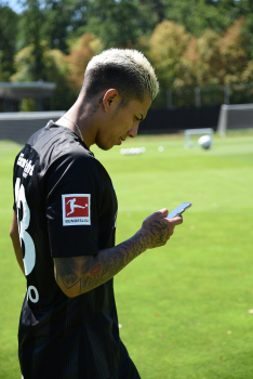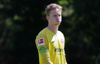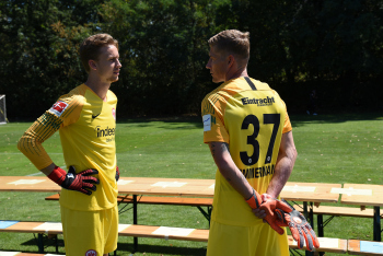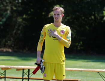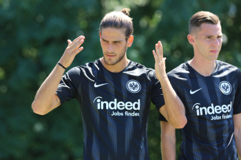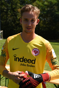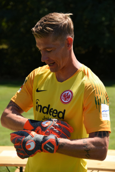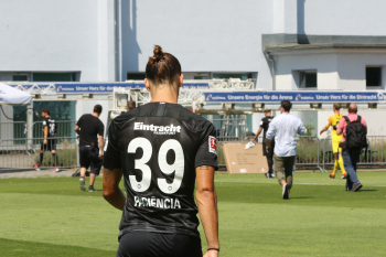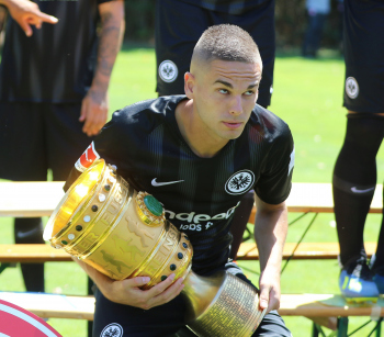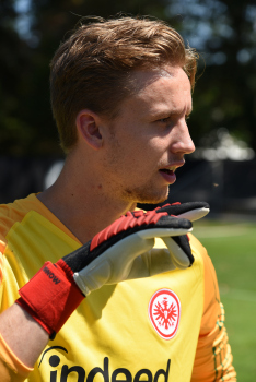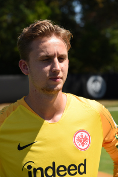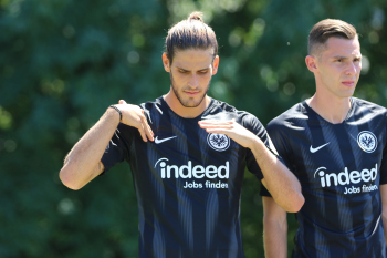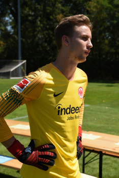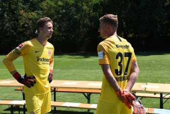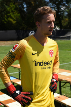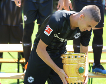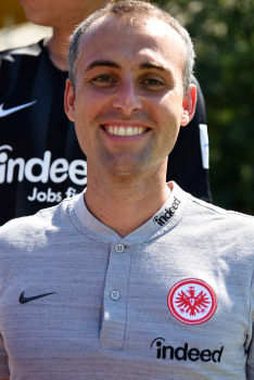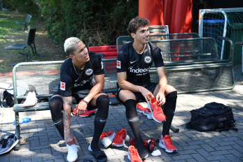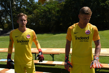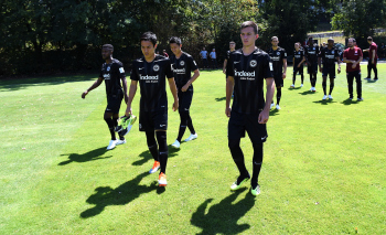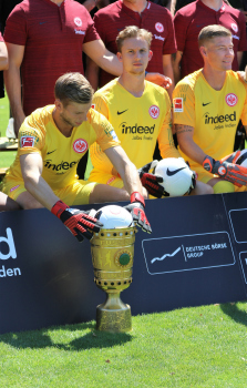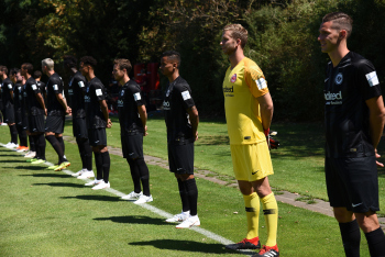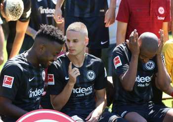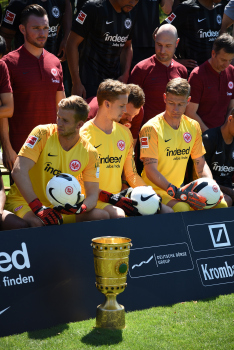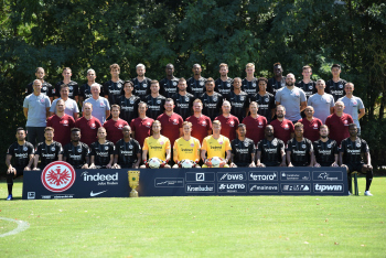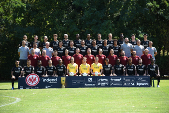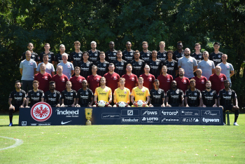 3. Reihe von links nach rechts: Sebastian Zelichowski (Leiter Analyse & Sporttechnologie), Markus Murrer (Athletiktrainer), Martin Spohrer (Athletiktrainer), Goncalo Paciencia (39), Branimir Hrgota (31), Carlos Salcedo (13), Simon Falette (3), Timothy Chandler (22), Marijan Cayar (42), Daichi Kamada (40), Dr. Christoph Seeger (Mannschaftsarzt), Dr. Wulf Schwietzer (Mannschaftsarzt).