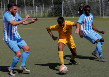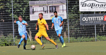 04.08.2019 Neu-Isenburg-Gravenbruch Saison 2019/2020 Glaabsbräu Pokal 1. Runde SSG Gravenbruch gegen TUS Zeppelinheim Torschütze Erik Liebert (SSG Gravenbruch) gegen zwei Spieler von Zepplinheim ****** Foto: Peter Hartenfelser