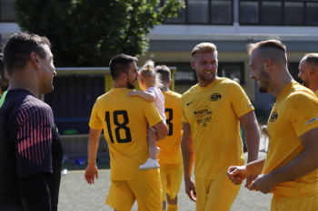 04.08.2019 Neu-Isenburg-Gravenbruch Saison 2019/2020 Glaabsbräu Pokal 1. Runde SSG Gravenbruch gegen TUS Zeppelinheim Torjubel und Gratulation für den Torschützen Erik Liebert (SSG Gravenbruch) ****** Foto: Peter Hartenfelser