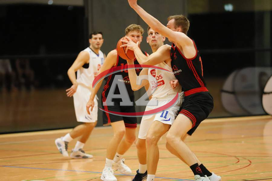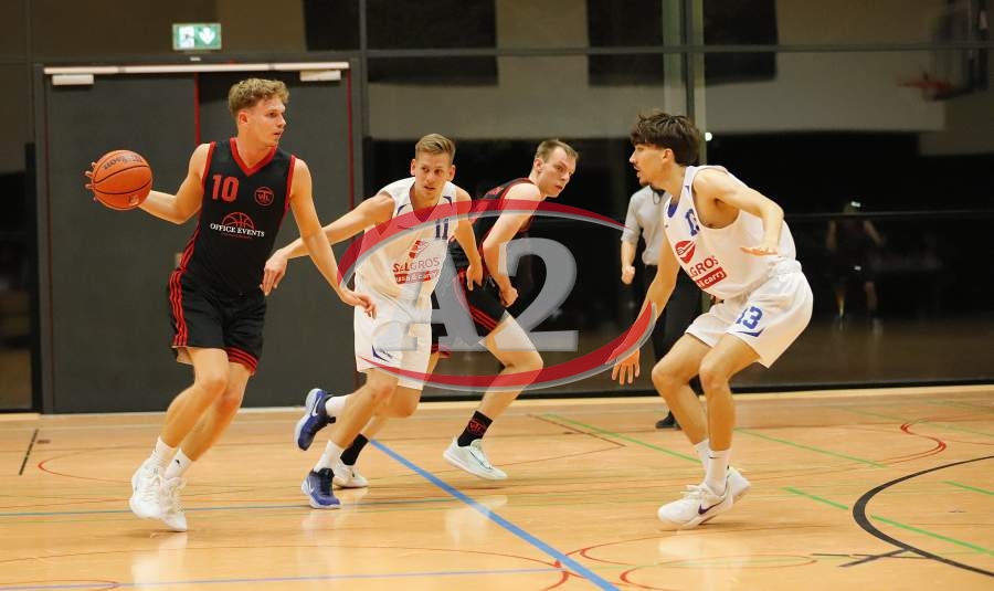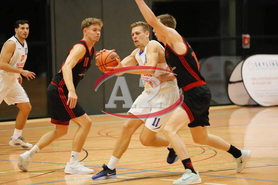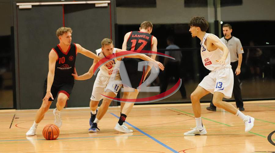 27.09.2025 xphx Neu-Isenburg, Sportpark Basketball 2. Regionalliga Herren Nord BC Neu-Isenburg - TV Langen II Niklas Keßler (10, TV) gegen Julian Tim Smuda (3, BC) und Daniel Hack (5, TV) ********* Foto: Peter Hartenfelser