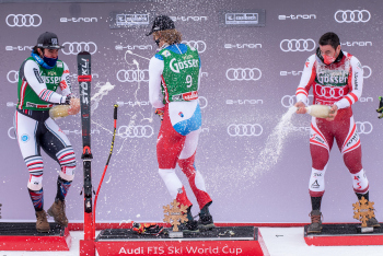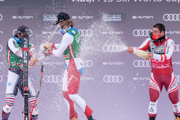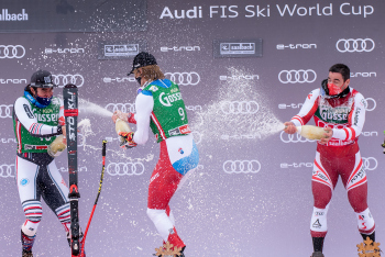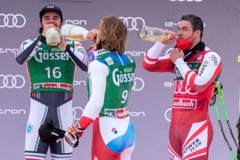 Feature, Symbolbild, das Siegerpodest auch Stockerl genannt mit den Siegerpokale und den Champagnerflaschen.