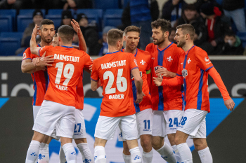 Darmstädter Torjubel, v.l. Klaus Gjasula, Emir Karic, Tim Skarke, Matthias Bader, Tobias Kempe, Torschütze Luca Pfeiffer und Bartol Franjic (SV Darmstadt 98).