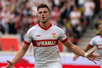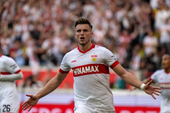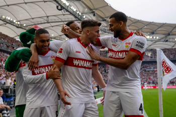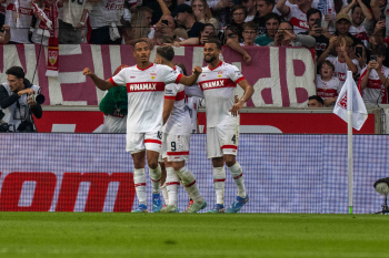 Stuttgarter Torjubel, v.l. Enzo Millot, Jamie Leweling, Torschütze Ermedin Demirovic und Josha Vagnoman (VfB Stuttgart).