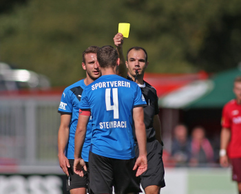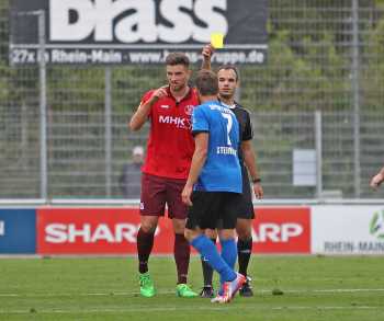 xxx 16.09.2017, Fussball Lotto Hessenliga, SC Hessen Dreieich - SV Steinbach, emspor v.l. gelbe Karte fuer Steffen Trabert Kapitaen (SV Steinbach), von Marco Unholzer (Birkenau) Schiedsrichter