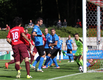 xxx 16.09.2017, Fussball Lotto Hessenliga, SC Hessen Dreieich - SV Steinbach, emspor v.l. Pfostentreffer, Kheibar Amani (SC Hessen Dreieich), Petr Kvaca (SV Steinbach), Marco Motzkus Torwart (SV Steinbach)