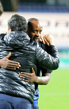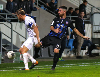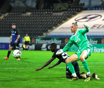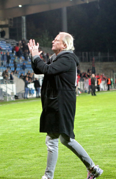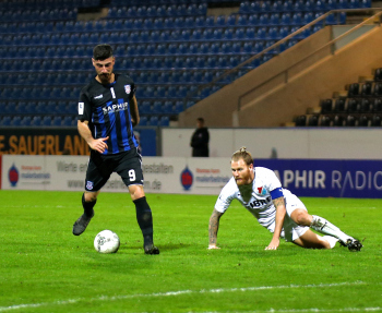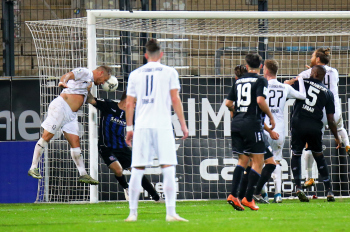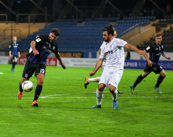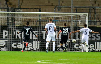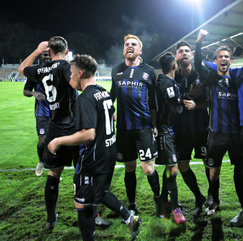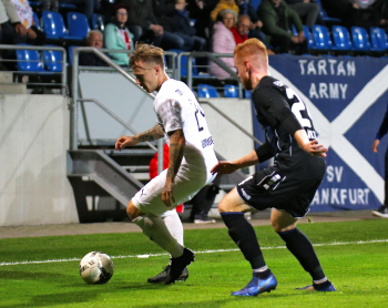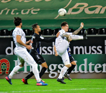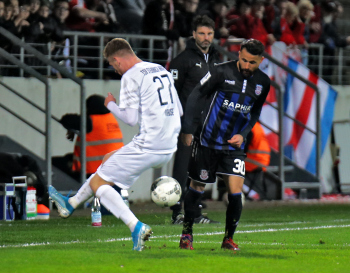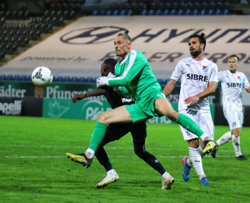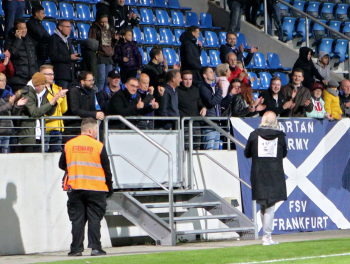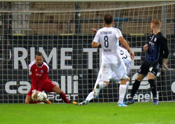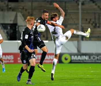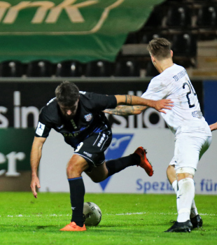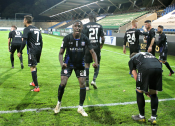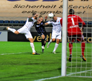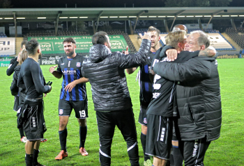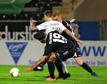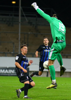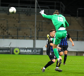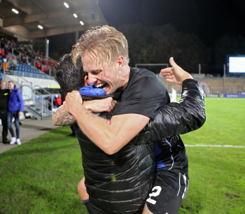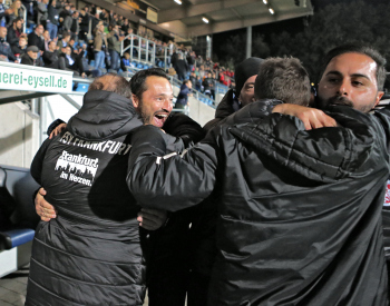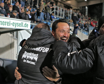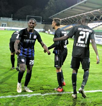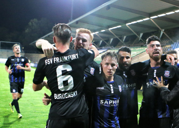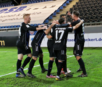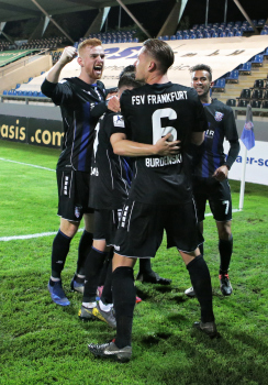 25.10.2019, xxx, Frankfurt, PSD Arena, Fussball, Regionalliga Suedwest, Saison 2019-2020, FSV Frankfurt gegen TSV Steinbach-Haiger; Jubel nach dem 2:0 in der 62. Minute durch Arif Gueclue (FSV Frankfurt), Freude mit Lukas Wilton (FSV Frankfurt), Fabian Burdenski (FSV Frankfurt), Ahmed Azaouagh (FSV Frankfurt), Steffen Straub (FSV Frankfurt),