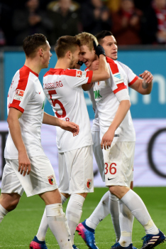 Leipziger Torjubel mittendrin der Torschuetze Marvin Compper (RB Leipzig), Diego Demme (RB Leipzig), Willi Orban (RB Leipzig), Benno Schmitz (RB Leipzig), Georg Teigl (FC Augsburg) enttaeuscht.