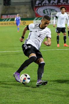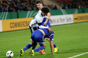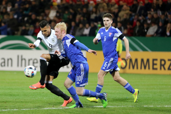 Leroy Sane (GER) setzt sich hier durch gegen Jonas Gejel Hansen (Faroe)