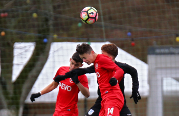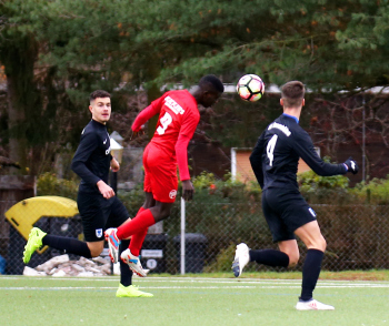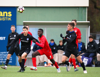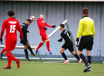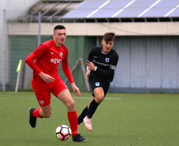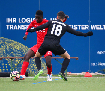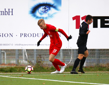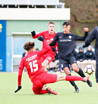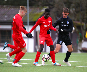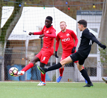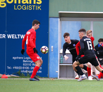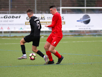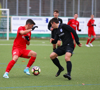01.12.2019, xxx, B-Jugend Hessenliga, U17, Offenbach; Saison 2019-2020, Stadion Auf der Rosenhoehe, SG Rosenhoehe Offenbach U17 gegen OFC Kickers Offenbach U17; in schwarz Damjan Ivosevic (SG Rosenhoehe Offenbach U17); gegen Sedek Bangura (OFC Kickers Offenbach U17); rechts Damjan Ivosevic (SG Rosenhoehe Offenbach U17);