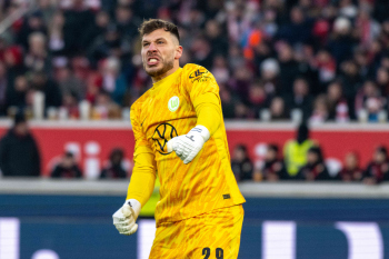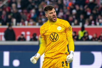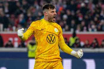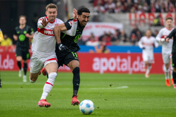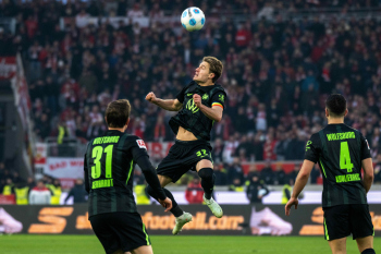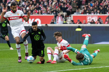 Julian Gaston Chabot, Nick Woltemade (VfB Stuttgart), Denis Vavro und Torwart Marius Müller (VfL Wolfsburg).