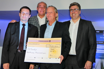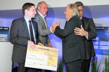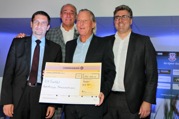 08.06.2017 Frankfurt am Main, Frankfurter Volksbank Stadion, FSV Frankfurt Charity-Dinner Eintracht Frankfurt Finanzvorstand Oliver Frankenbach, Pr?sident Peter Fischer, Vorstand Axel Hellmann ?bergeben den Scheck ?ber 150.000 Euro an FSV Frankfurt Pr?sident Michael G?rner *** Foto: Hartenfelser