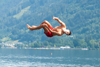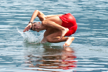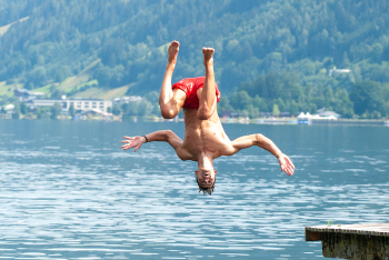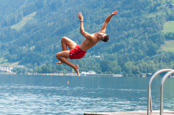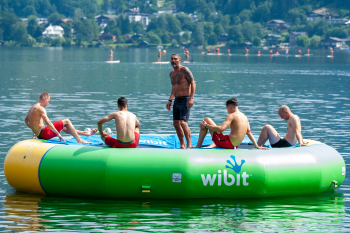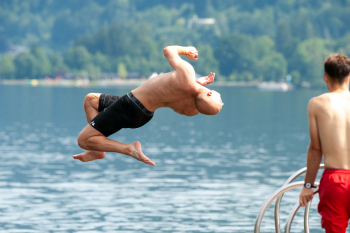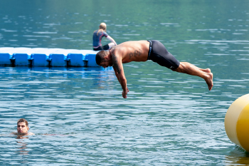 Nach dem Training sucht man die abkühlung im See, Daley Sinkgraven (Bayer 04 Leverkusen), Co-Trainer Hendrie Krüzen (Bayer 04 Leverkusen), Kai Havertz (Bayer 04 Leverkusen) und Torwart Niklas Lomb (Bayer 04 Leverkusen).