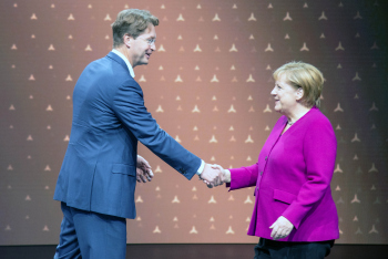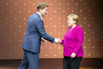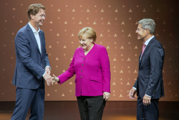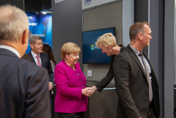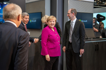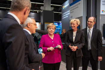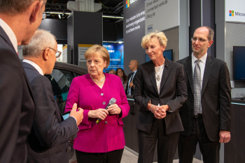 Prof. Franz Pischinger, Bundeskanzlerin Angela Merkel, Sabine Bendiek (Vorsitzende der Geschäftsführung von Microsoft Deutschland) und Scott Guthrie (Executive Vice President der Cloud- und AI-Grupp Microsoft).