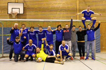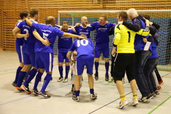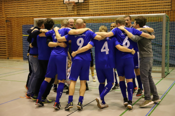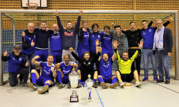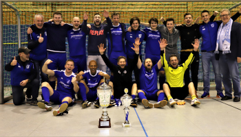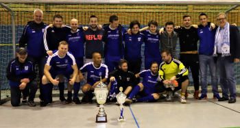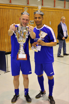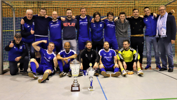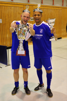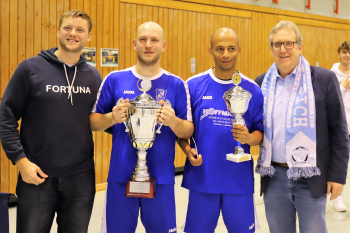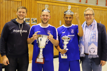 12.01.2019 Dreieich-SprendlingenDreieicher Hallen-Stadtmeisterschaft 2019FINALE Jubel bei den Siegern der SG Götzenhain (blau)Siegerehrung Clemens Weingärtner Vorstand Fortuna Dreieich Martin Krust und Tarik Kifle (SG Götzenhain)Bürgermeister Bürgermeister Dieter Zimmer ******Foto: Peter Hartenfelser