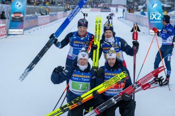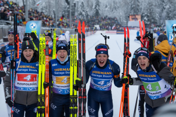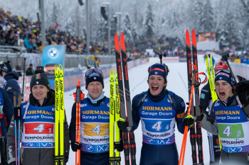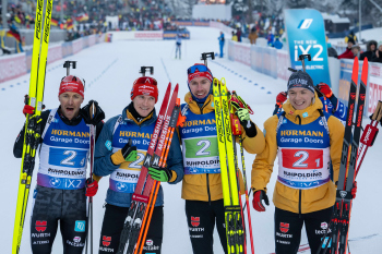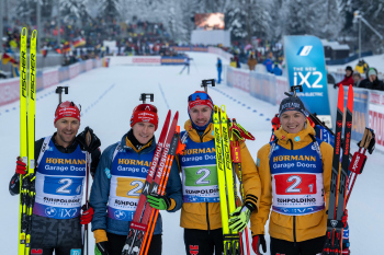 Jubel und Freude bei der deutschen Staffel über den 2ten Platz, v.l. Philipp Nawrath (GER), Benedikt Doll (GER), Johannes Kuehn (GER) und Justus Strelow (GER).